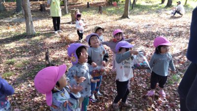 色々な葉っぱや木の実の写真が載っている図鑑を見て、「えい、えい、おー!」たくさん見つけるぞ!!