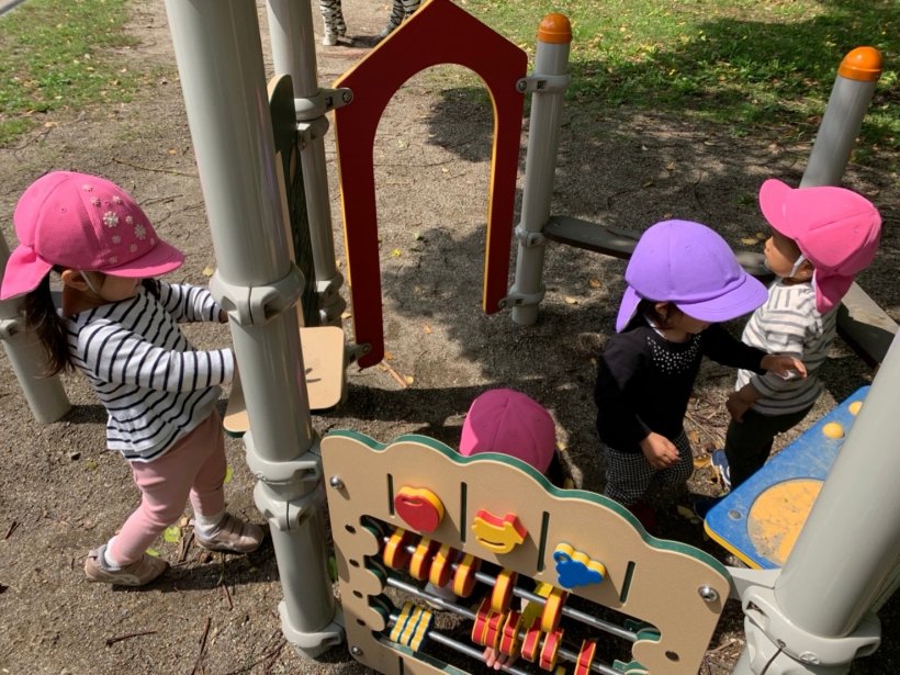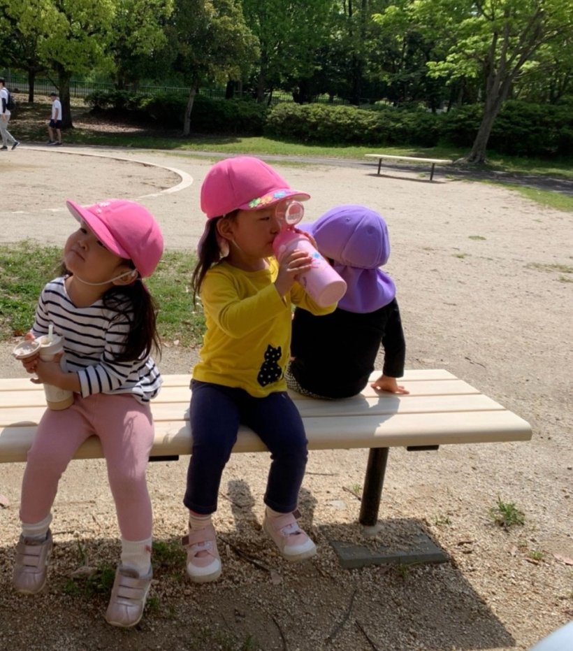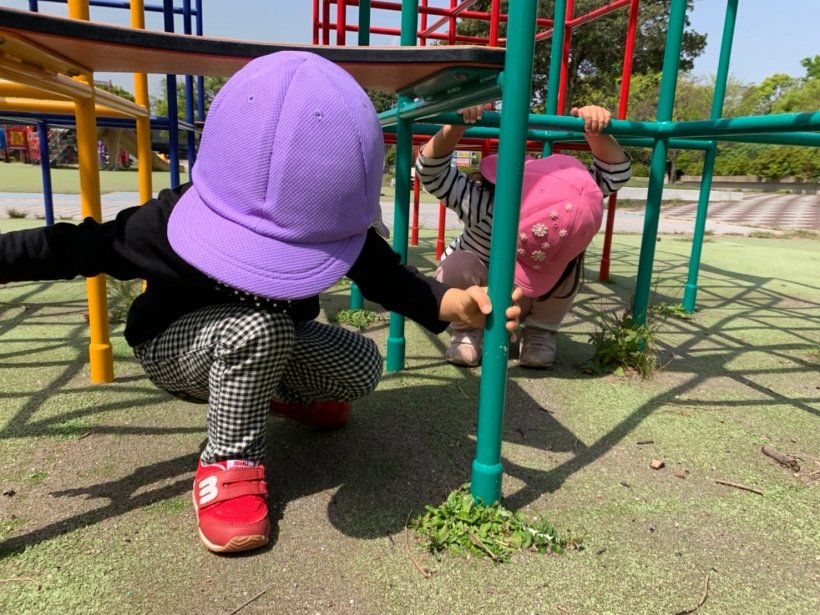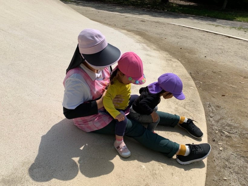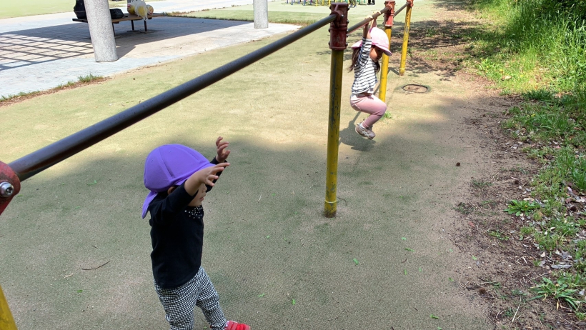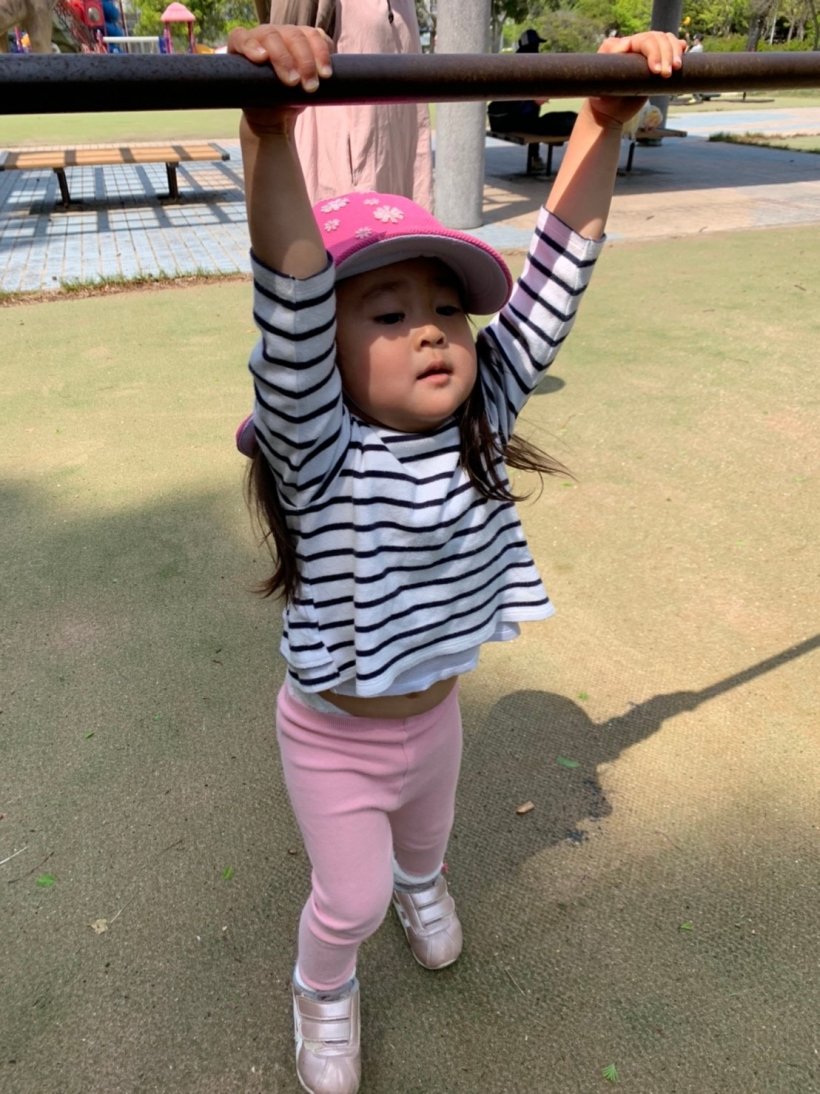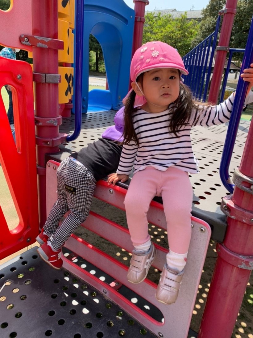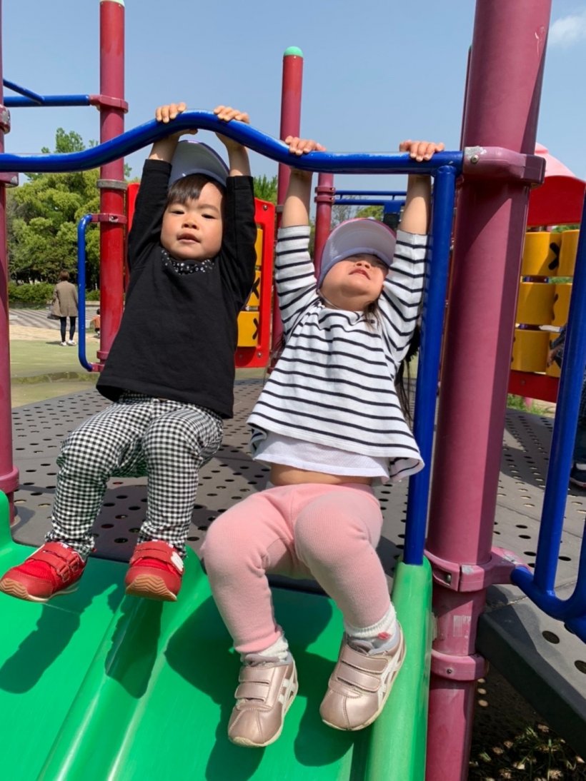 2021年04月30日(金) お知らせ 4/30(金)☆だいすき大高緑地☆ きょうは大高緑地だよーと言うとみんな大喜び!! はりきっておしたくしてくれました♪ 仲良くぶらーん! お空がまぶしい〜 せんせいのおひざでしゅーーー♪ いっぱいあそんだね♪