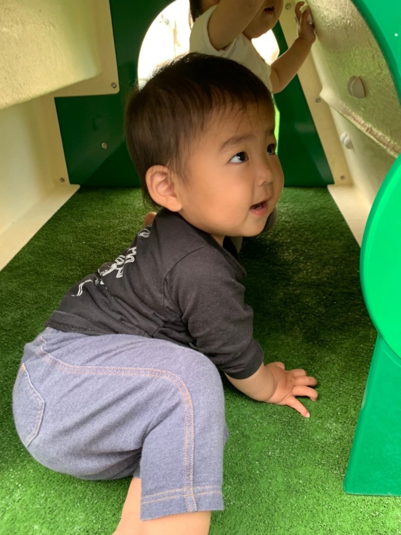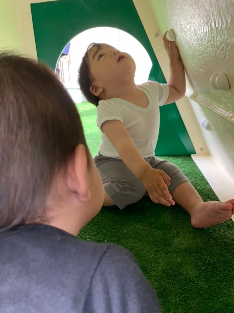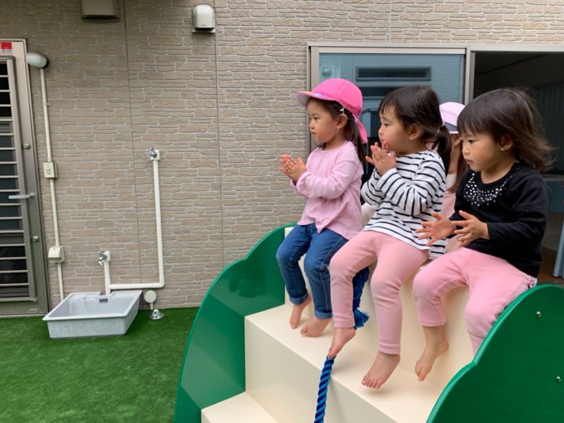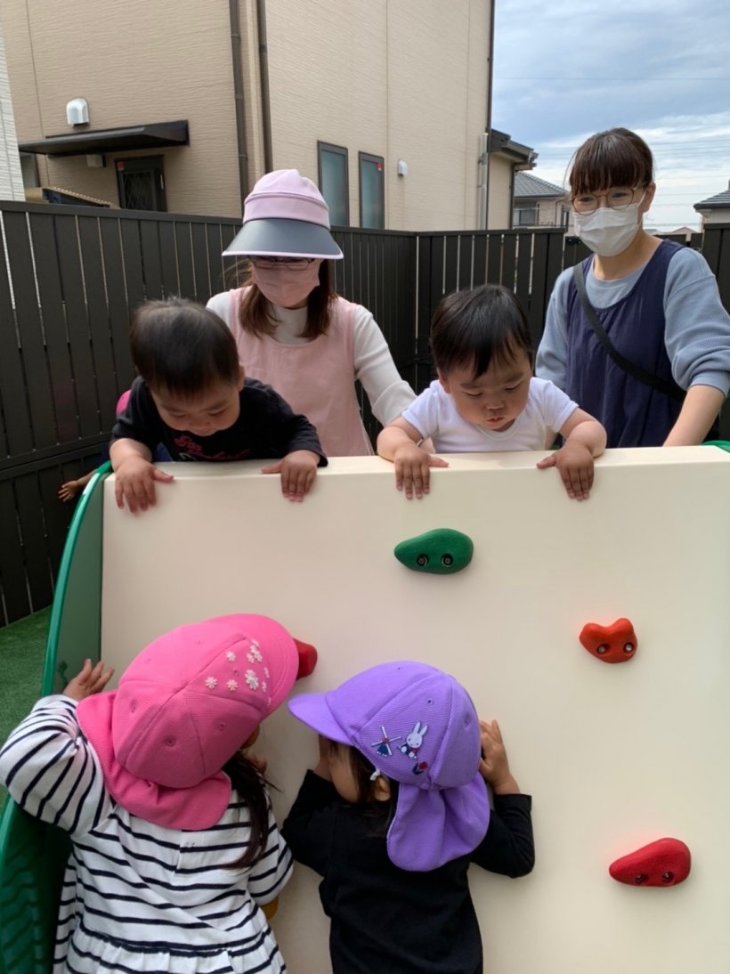 2021年05月11日(火) お知らせ 5/11(火)☆テラスにかわいいおやま☆ 今日はテラスにかわいいおやま型の遊具が登場しました! 中はトンネルだよ☆ ロッククライミングと、お山登りもできるよ☆ これからたくさん遊ぼうね! お昼は緑地へ行ったよ♪