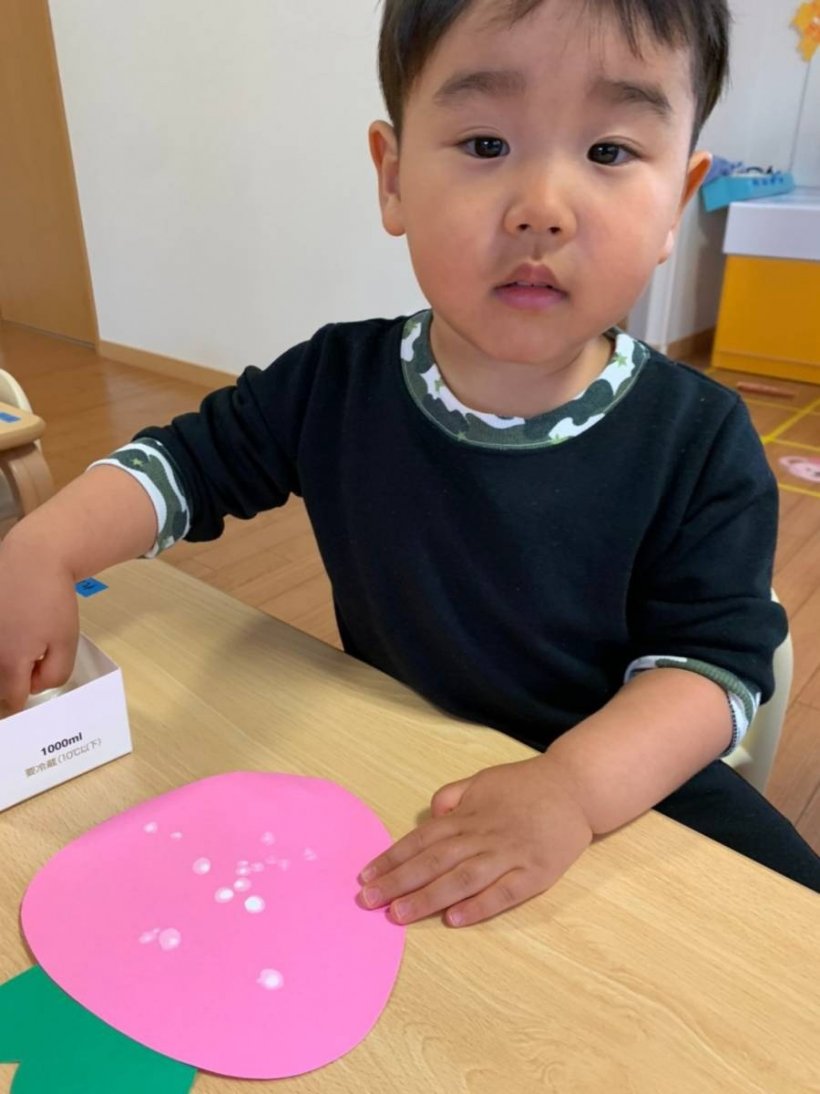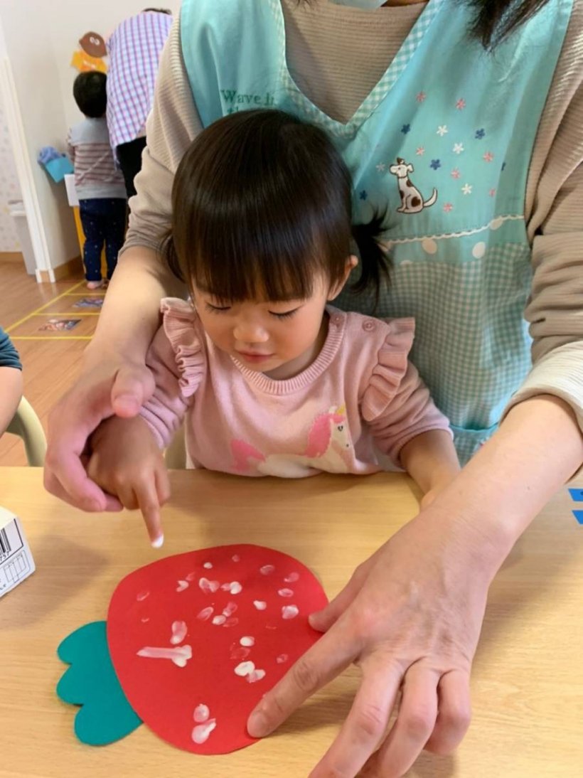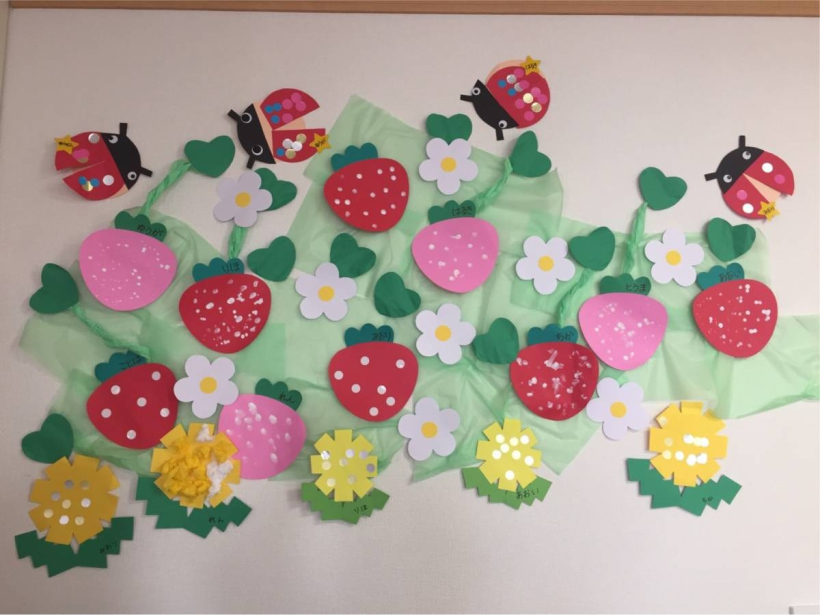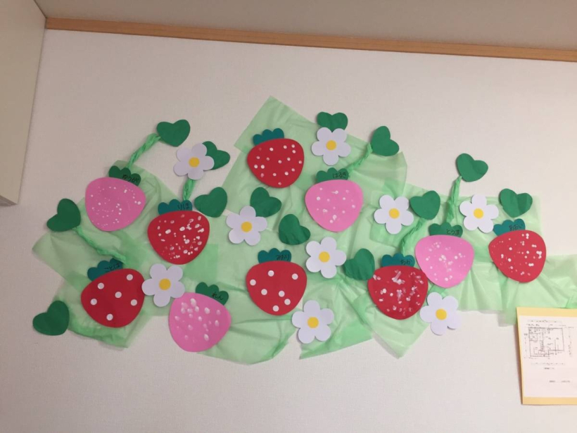 2021年03月04日(木) お知らせ 3/2(火)☆可愛いいちご制作☆ 赤やピンクの色画用紙に小さい子は丸シール、大きい子たちは指でぽんぽんと絵の具を付けて、いちごを作りました。 お部屋に飾ったら、いちご畑みたいになったね♪ たくさん遊んだら、大好きなブランケットとおやすみなさい☆ 起きたら、おやつを食べようね。