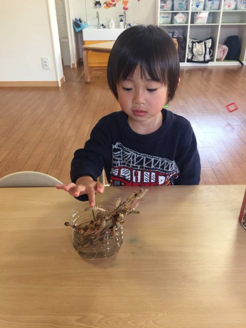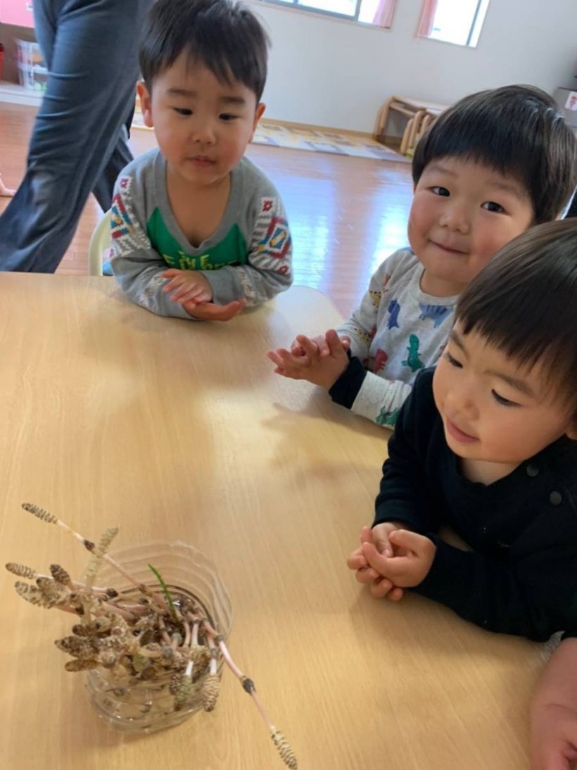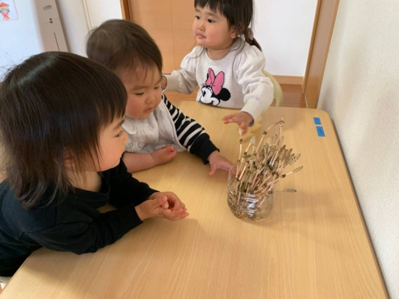 2021年03月09日(火) お知らせ 3/8(月)☆小さな春のプレゼント☆制作・てんとう虫☆ 今朝、保育園に素敵なプレゼントが届きました。 摘みたてのつくしです。 お散歩でもまだ見つけたことのない”つくし”に「においする?」「さわっていいい?」など興味津々! 素敵な春のプレゼントをありがとうございます。 制作はてんとう虫を作りました。 いちごとたんぽぽ畑の周りに飛ばしてみたら、春らしさが広がりました♪