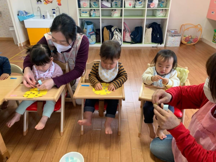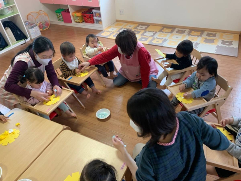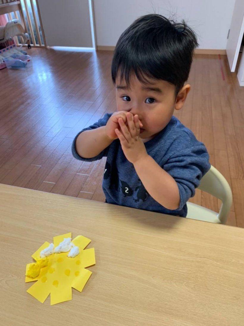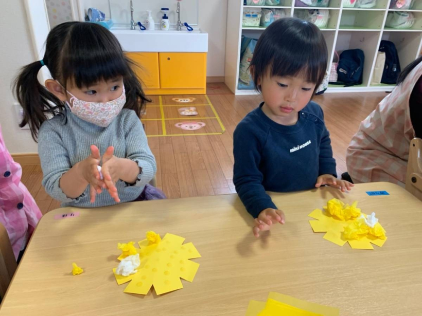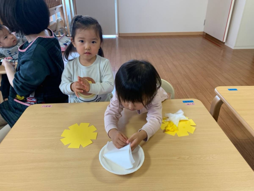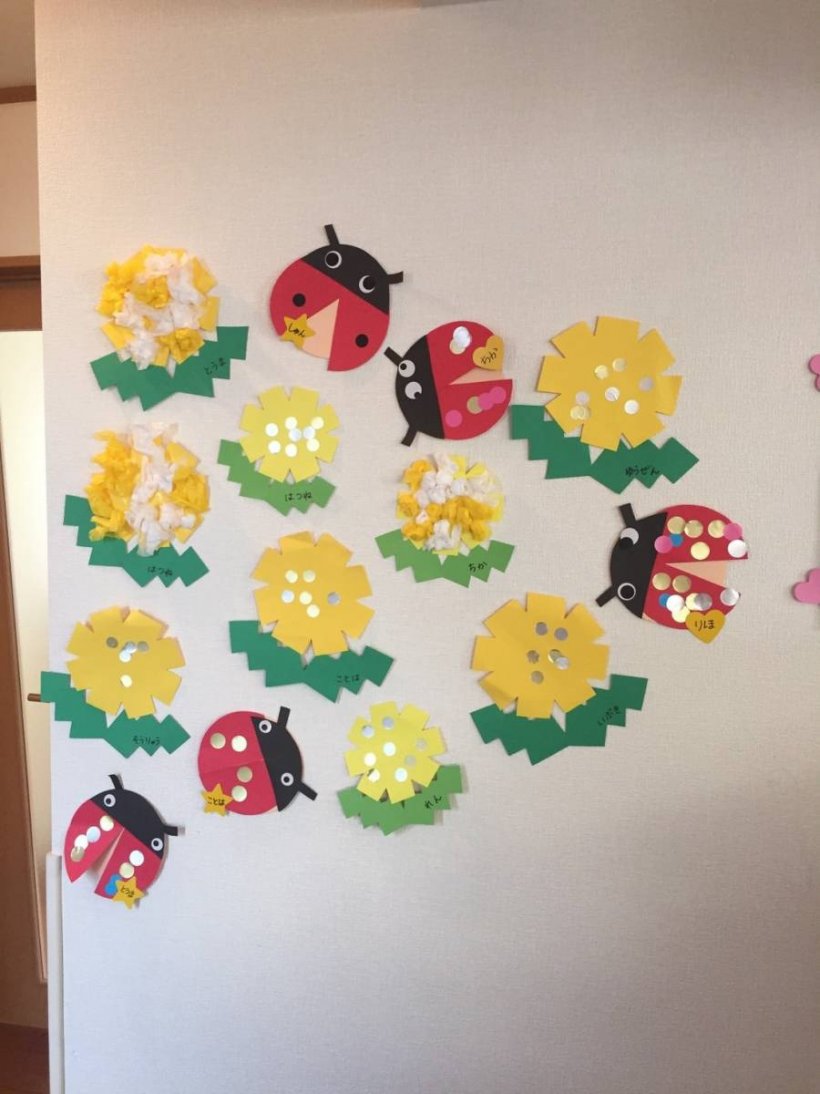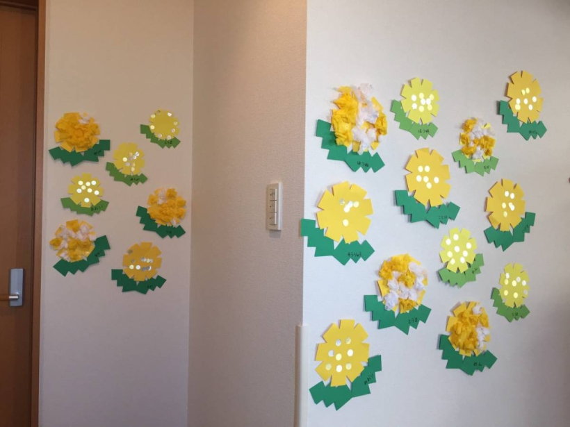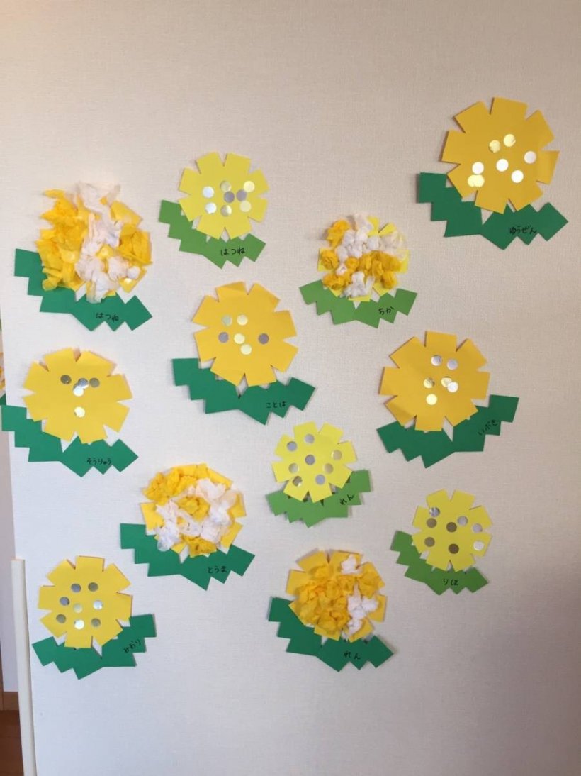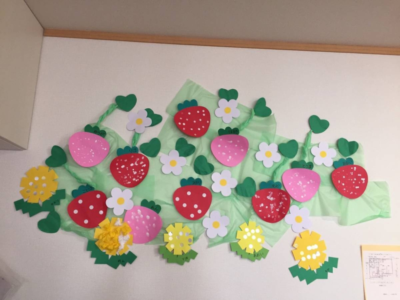 2021年03月09日(火) お知らせ 3/5(金)☆可愛いたんぽぽ制作☆ 少しずつ暖かくなって来ました。 今日は、たんぽぽを作りました。 小さい子たちは丸シール、大きい子たちは、お花紙を丸めて貼り、いちご畑の周りに少し貼ったら、一段と春らしくなりました♪