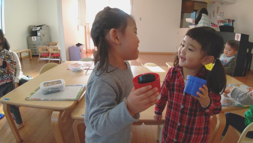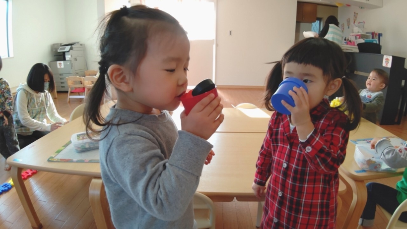 2021年05月10日(月) お知らせ 5/10(月)☆いろいろアラカルト☆ こっそり・・・ ひみつ基地? ちょっとすっぱい気がする・・・ ソーシャルディスタンス??? かんぱいする2人 これはっ、おいしそうだ! なーんだ?