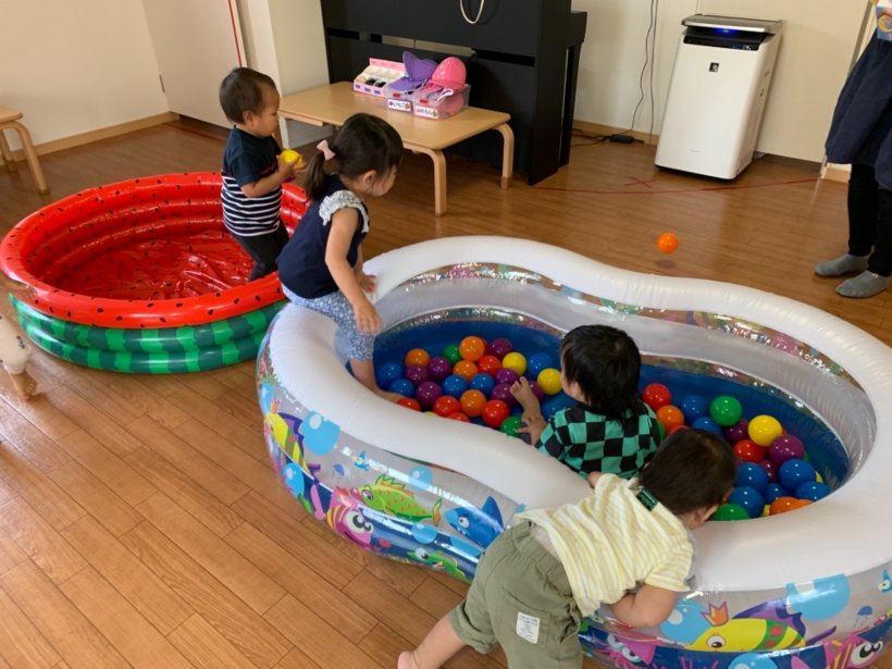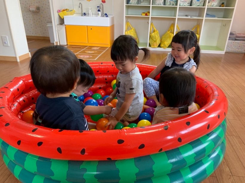 2021年06月02日(水) お知らせ 6/2(火)☆たのしみみずあそび☆ みずあそびのプールにボールを入れてボールプール♪ 楽しくって大はしゃぎ♪ みずあそびがたのしみだね! 午前中は、恐竜公園へ! いっぱいあそんでおなかぺこぺこ!