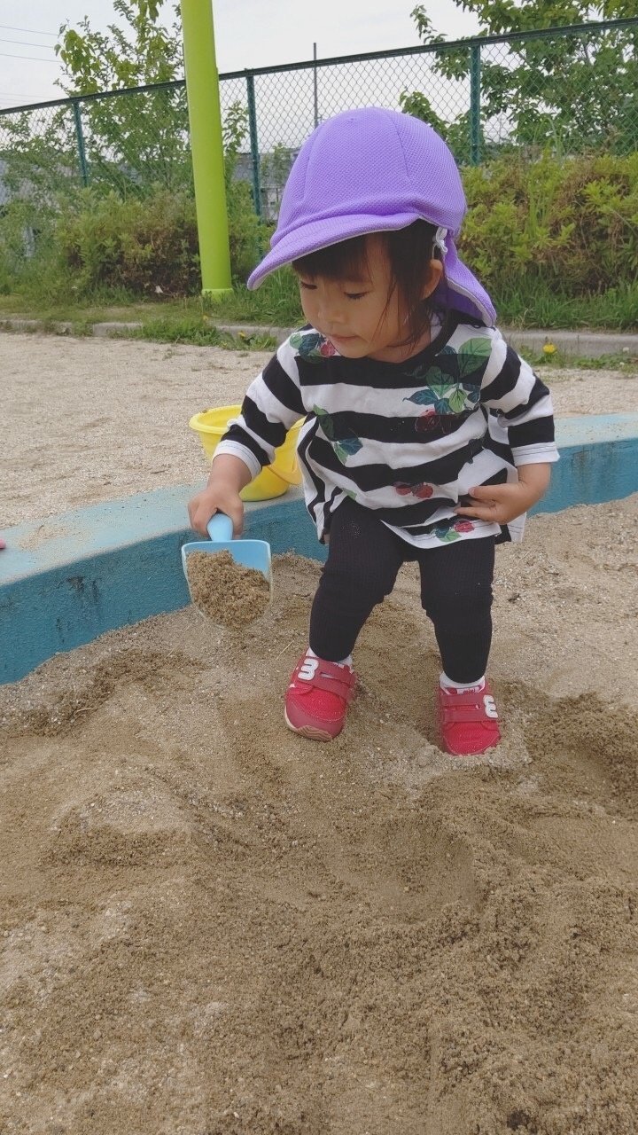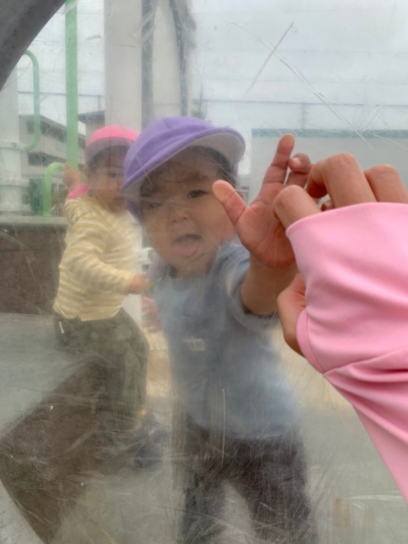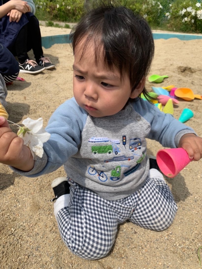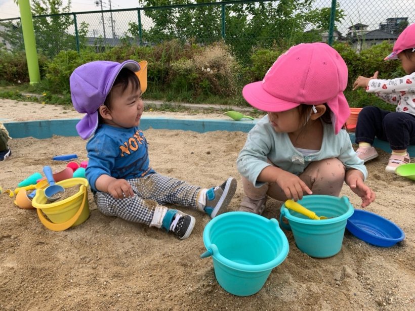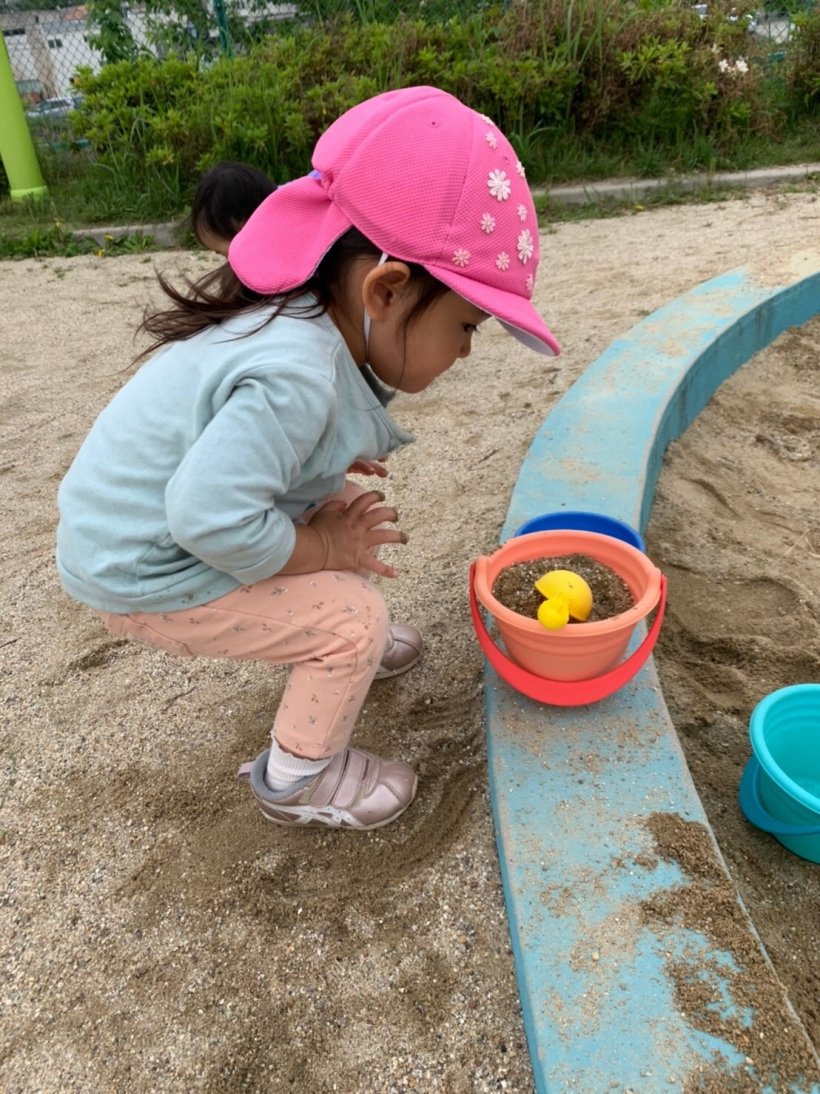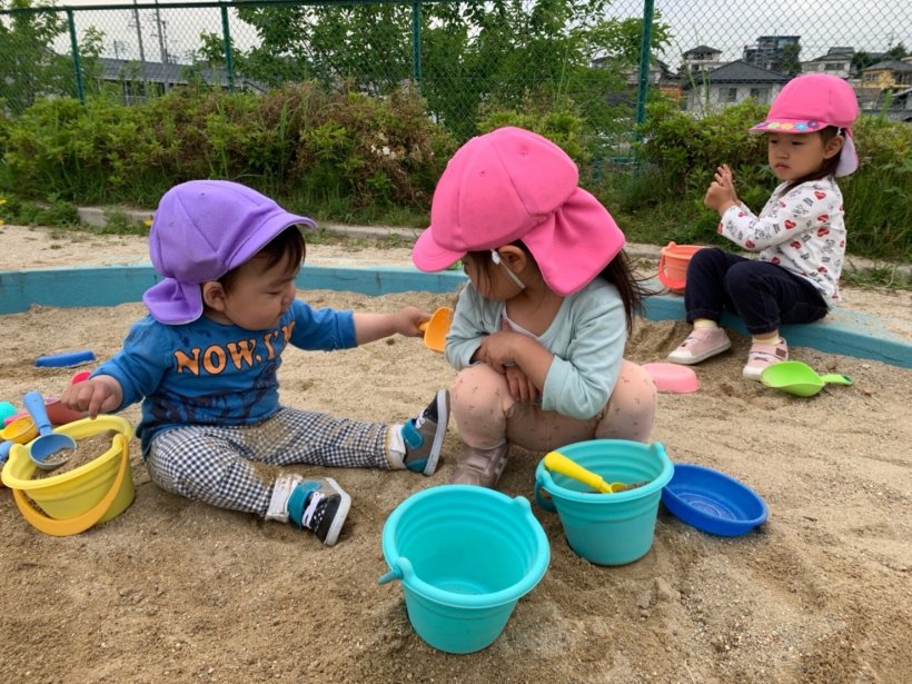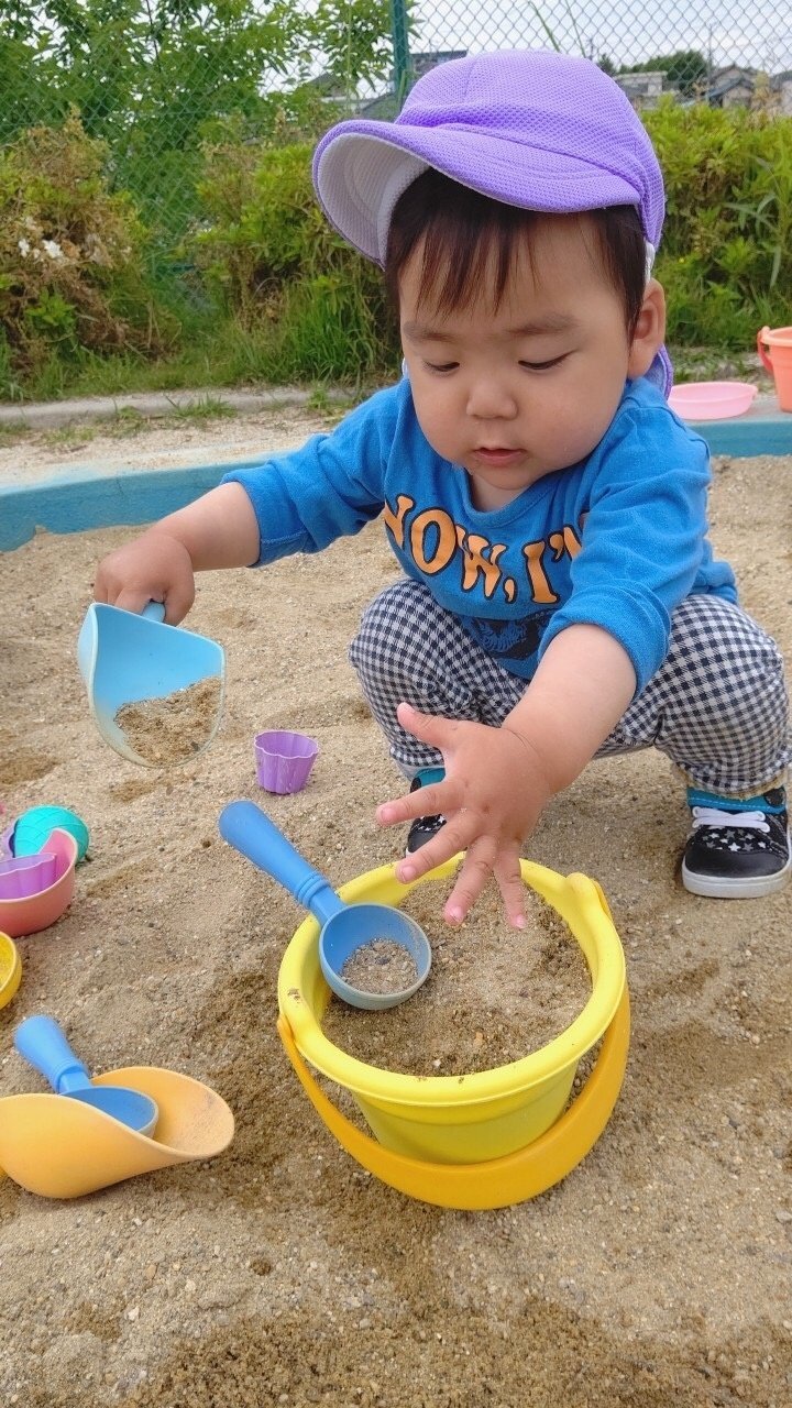 2021年05月06日(木) お知らせ 5/6(木)☆連休明けの子どもたち☆ 気になる! 楽しいすなば(^-^) あれっ! どこで見てるの? おやつのあとはテラスであそんだよ これ(わに)が欲しかったんだ。